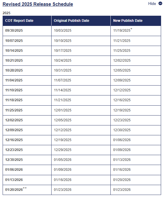 CFTCのWebサイト(https://www.cftc.gov/MarketReports/CommitmentsofTraders/index.htm)の修正版予定表をキャプチャー致しましたので、よろしければご参照ください。