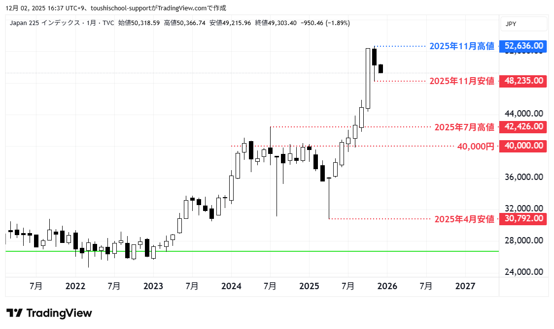 4月以来、ここに来てやっと押し目らしい押し目ができ、11月の高値安値が当面の基準(ちなみに、10月足の半値水準が11月安値)になりますが、その下側となると余りに一方的な上昇をしてきた分、2024年の中心的な揉み合い高値の40,000円付近、あるいは同年7月の上ヒゲ高値の42,400円付近のみが、大きな意味での「時間が経過しても変わらない事実」となります。