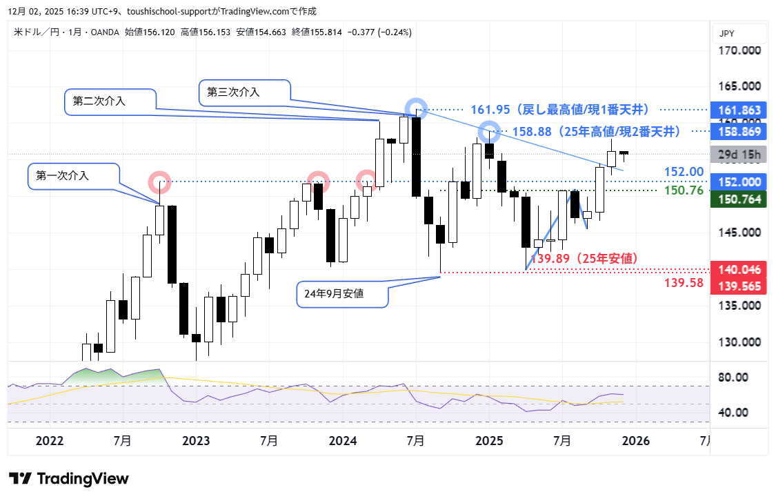 2025年のドル円相場を月足でみると