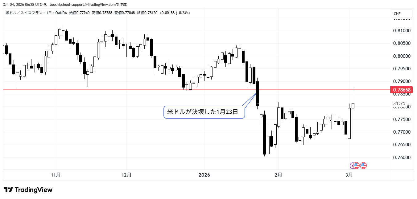 少なくともドルスイス相場で見る限り、週明けの2日間はドル買いが優勢であり、スイスフランですらドルの方が強い状況は意外です。